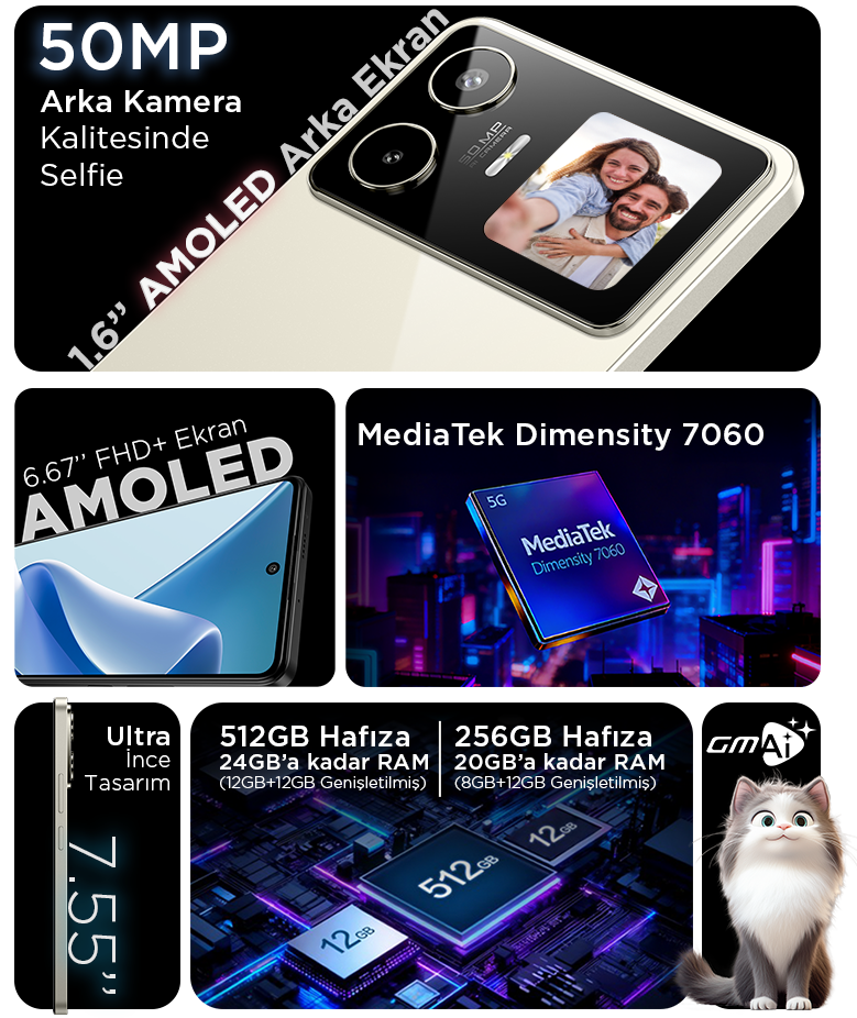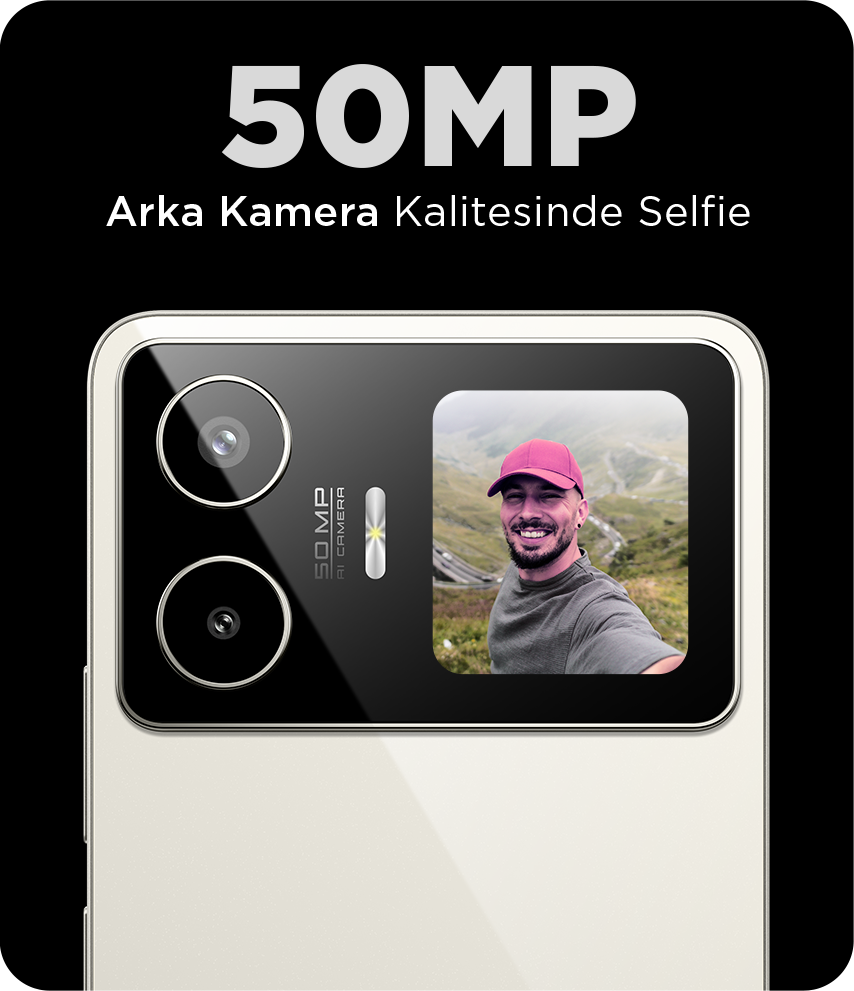50MP AI kamera, ışığı ve sahneyi otomatik ayarlar.